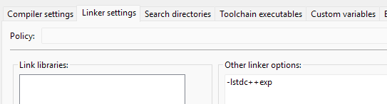 Als letzten Schritt öffnen Sie Tabulator Linker Settings und geben unter Other linker options die Option -lstdc++exp ein.
