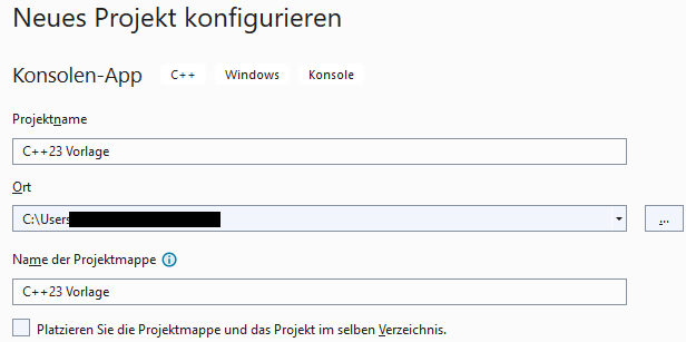 Starten Sie dazu Visual Studio und erstellen ein neues Projekt vom Typ Konsolen-App. Geben Sie dem Projekt z.B. den Namen C++23 Vorlage.