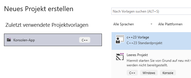 Ab jetzt können Sie im Dialog Neues Projekt erstellen durch Auswahl der Projektvorlage C++23 Vorlage eine C++23-kompatible Anwendungen erstellen.