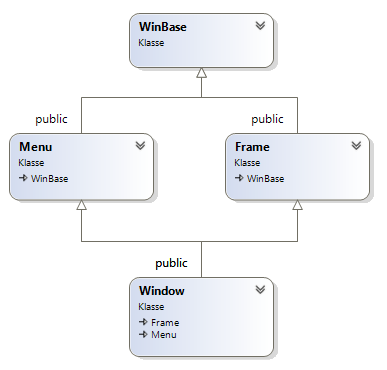 Oberste Basisklasse ist die Klasse WinBase. Davon abgeleitet werden die beiden Klassen Frame und Menu. Und aus diesen beiden Klassen wird eine neue Klasse Window gebildet. Da sowohl Frame als auch Menu von WinBase abgeleitet sind, erben diese beiden Klassen die Eigenschaften von WinBase. Wird aus Frame und Menu eine neue Klasse gebildet, enthält die neue Klasse die Eigenschaften von WinBase in zweifacher Ausführung, einmal von Frame und einmal von Menu.