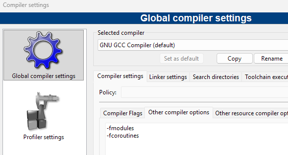 Gehen Sie in das Menü Settings – Compiler... und wählen zunächst die Option ...[-std=c++23] aus. Öffnen Sie anschließend den Reiter Other compiler options und geben dort die nachfolgenden zwei Zeilen ein.