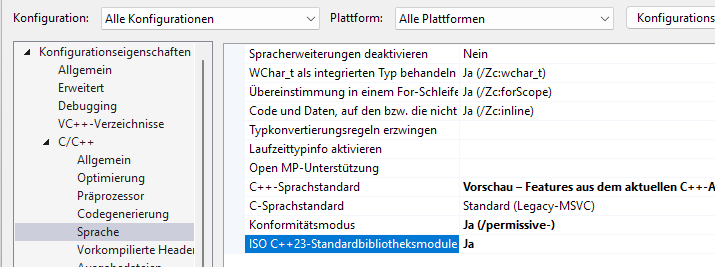 Anschließend wählen Sie links die Eigenschaften Sprache aus und stellen die Option C++-Sprachstandard auf Vorschau – .../std:c++latest und ISO C++23-Standardbibliotheksmodule auf Ja.