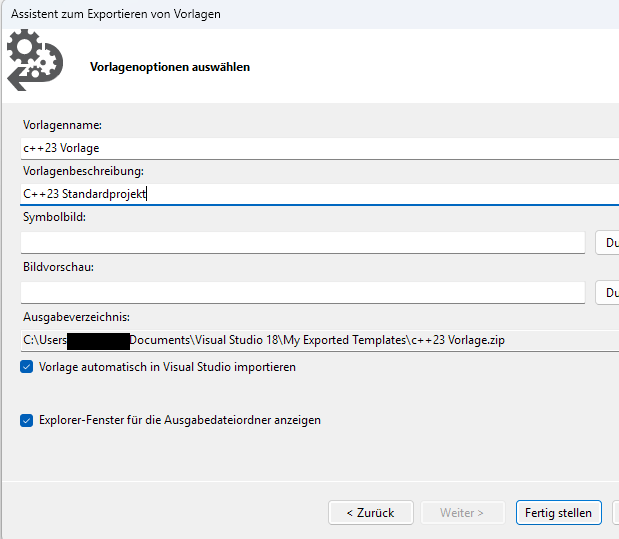 Geben Sie der Vorlage den Namen C++23 Vorlage und klicken zum Abschluss die Schaltfläche Fertig stellen an.