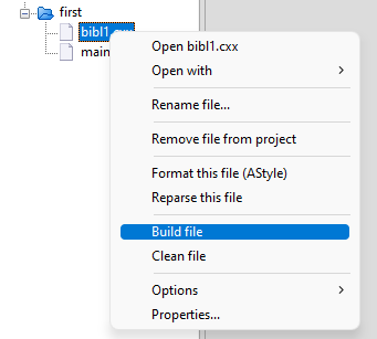 Hier sind keine weiteren Einstellungen notwendig, da diese bereits bei der Konfiguration des Compilers unter CodeBlocks entsprechend vorgenommen wurden. Sie müssen nur explizit im Workspace durch Auswahl der Option Build file die Modul-Datei vor der Quellcode-Datei übersetzen.