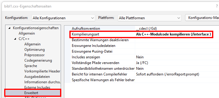 Im Projektmappen-Explorer die Eigenschaften der Modul-Datei öffnen. Anschließend auf die Eigenschaft C/C++ – Erweitert klicken und auf der rechten Seite unter Kompilierungsart die Option Als C++-Modulcode kompilieren auswählen.